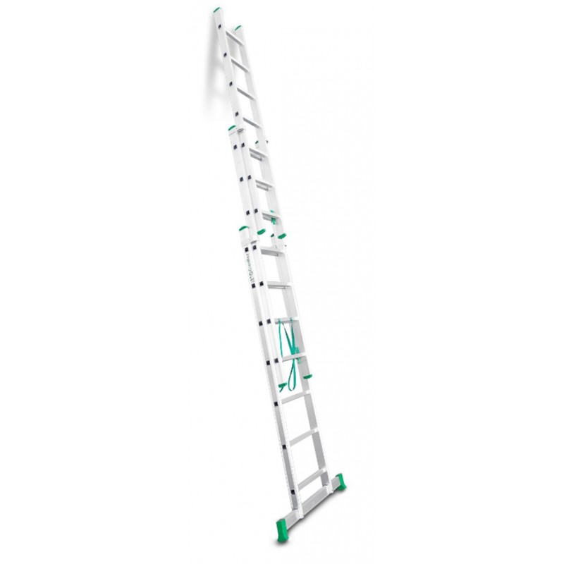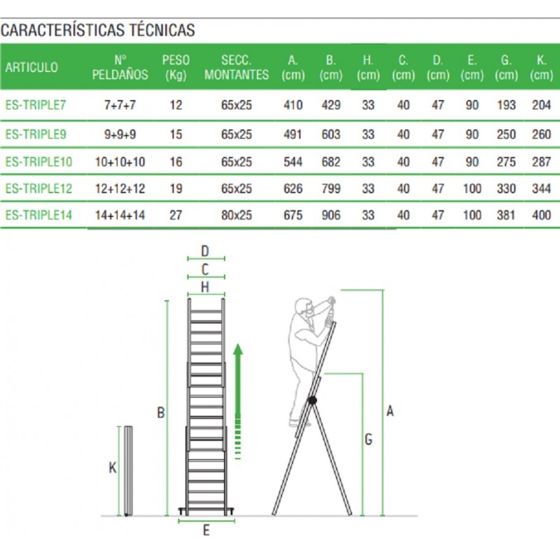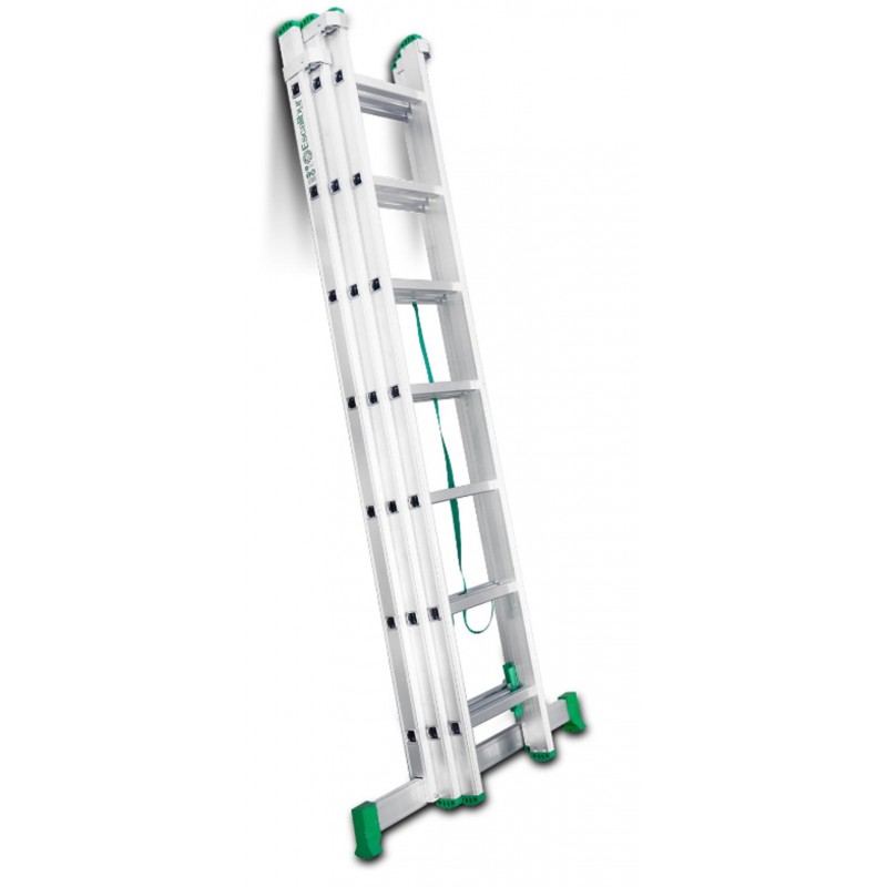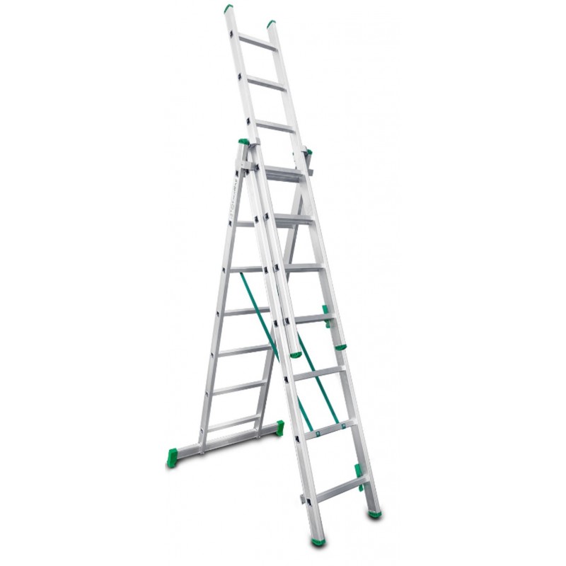 La ES-TRIPLE es una escalera de aluminio triple. Al ser una escalera multiusos combinada se puede utilizar como escalera de tijera de doble subida, los tres tramos se pueden extender y se puede usar como escalera de apoyo a pared, se puede poner en desnivel por lo cual es indicada para realizar tareas en suelos desnivelados como aceras o escaleras. Tiene los peldaños, del tramo anterior, antideslizantes con 3 cm de profundidad y la base estabilizadora con 2 tacos grandes de goma que le confiere mayor seguridad y agarre sobre todo en suelos de tierra que no estén correctamente nivelados. Dispone de un bloqueo de seguridad mediante un gancho con muelle práctico y seguro.
