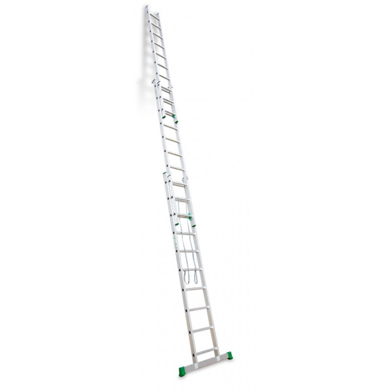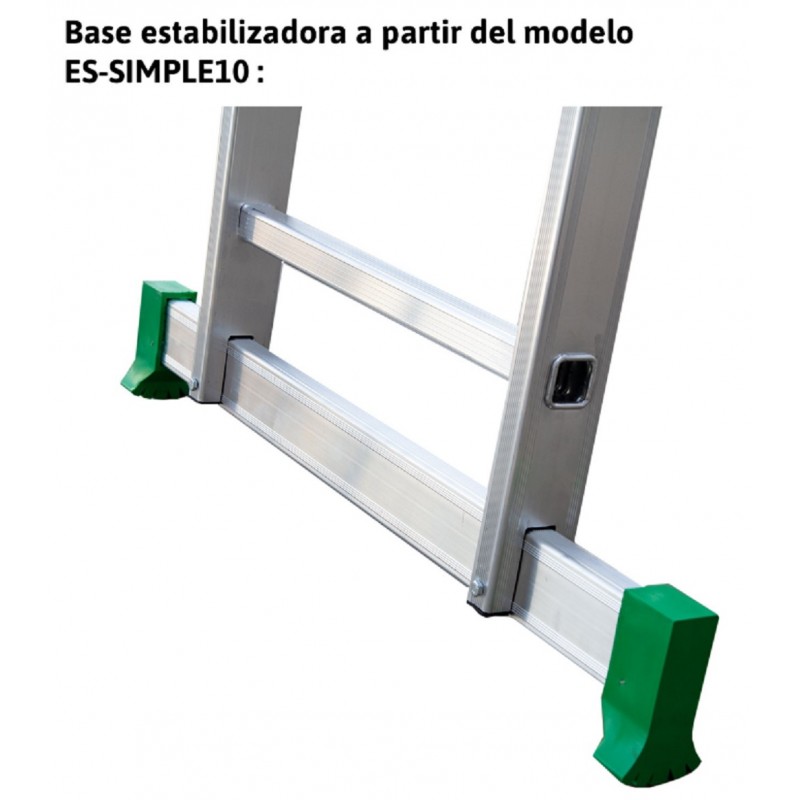 La ES-TRIPLE es una escalera de aluminio triple. Al ser una escalera multiusos combinada se puede utilizar como escalera de tijera de doble subida, los tres tramos se pueden extender y se puede usar como escalera de apoyo a pared, se puede poner en desnivel por lo cual es indicada para realizar tareas en suelos desnivelados como aceras o escaleras. Tiene los peldaños, del tramo anterior, antideslizantes con 3 cm de profundidad y la base estabilizadora con 2 tacos grandes de goma que le confiere mayor seguridad y agarre sobre todo en suelos de tierra que no estén correctamente nivelados. Dispone de un bloqueo de seguridad mediante un gancho con muelle práctico y seguro.