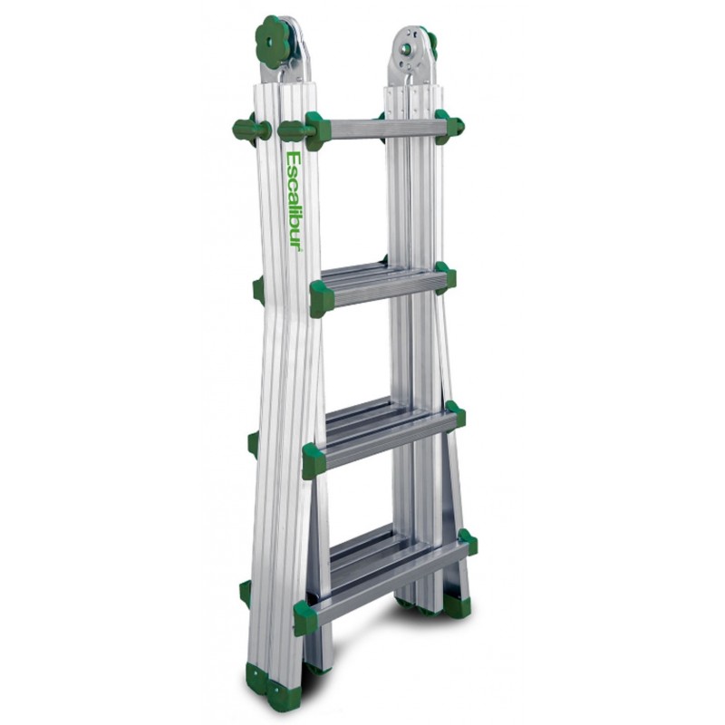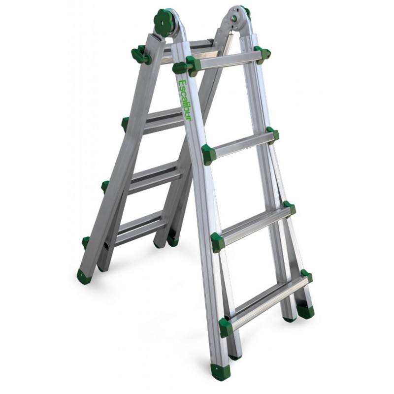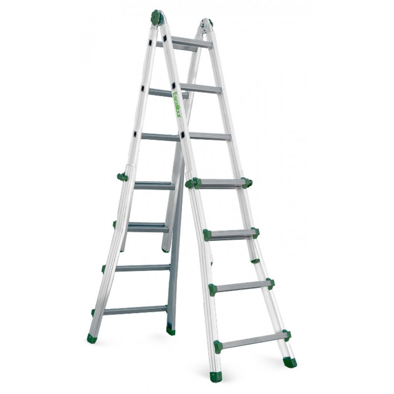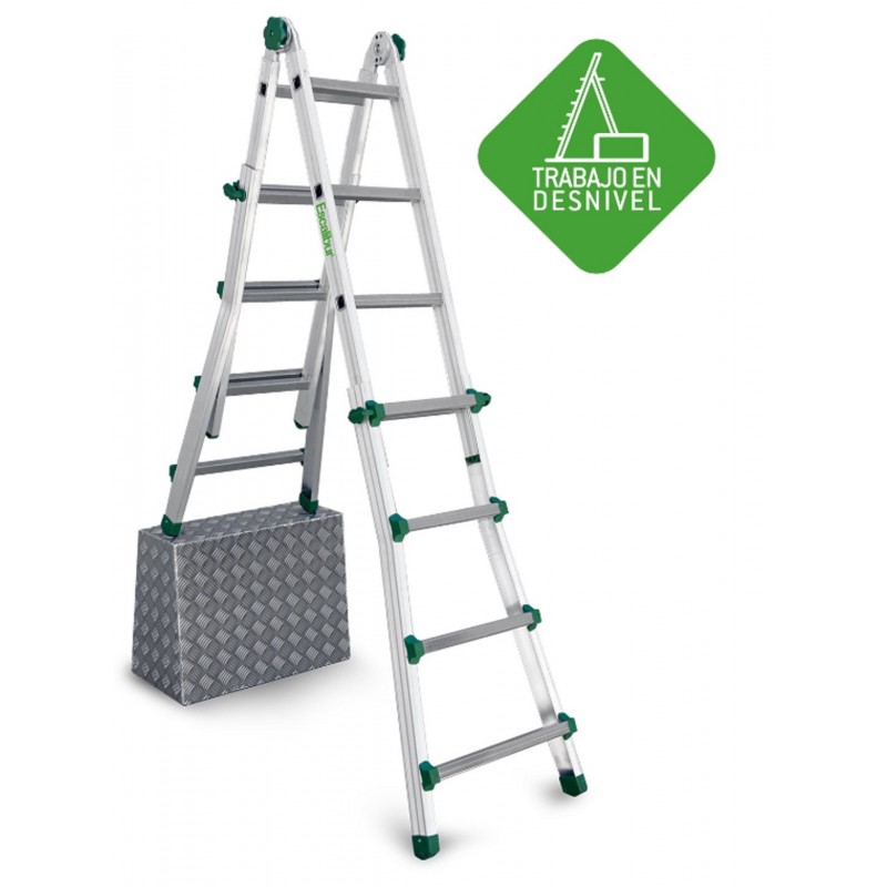 Escalera telescópica multiusos, con peldaños de 3 cm y sistema de bisagra patentado.