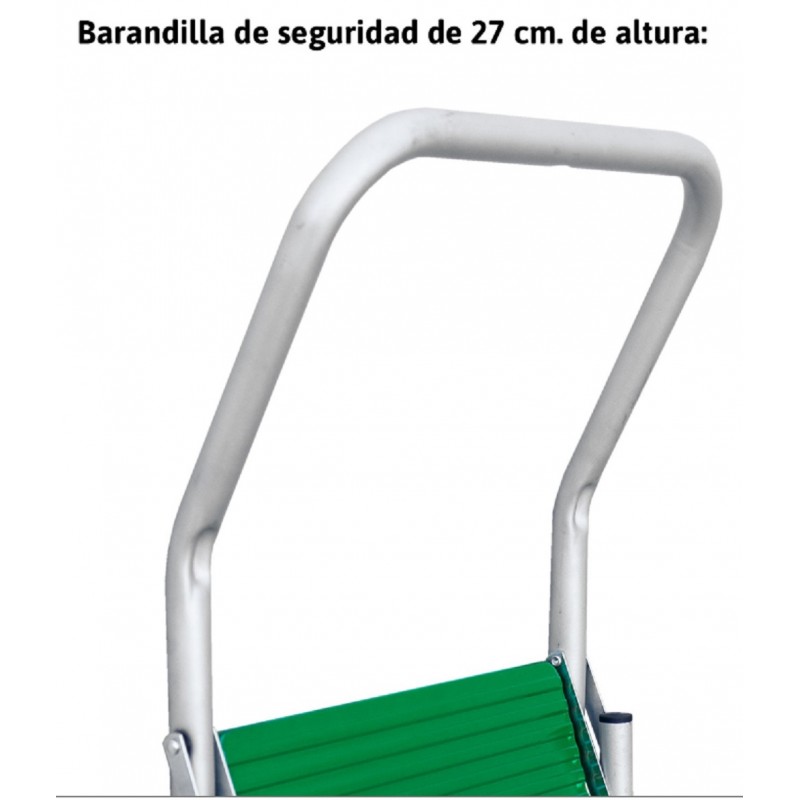 Taburete en acero galvanizado con barandilla y peldaños cómodos.