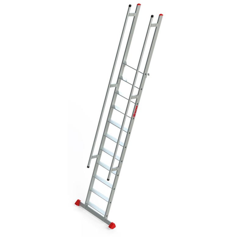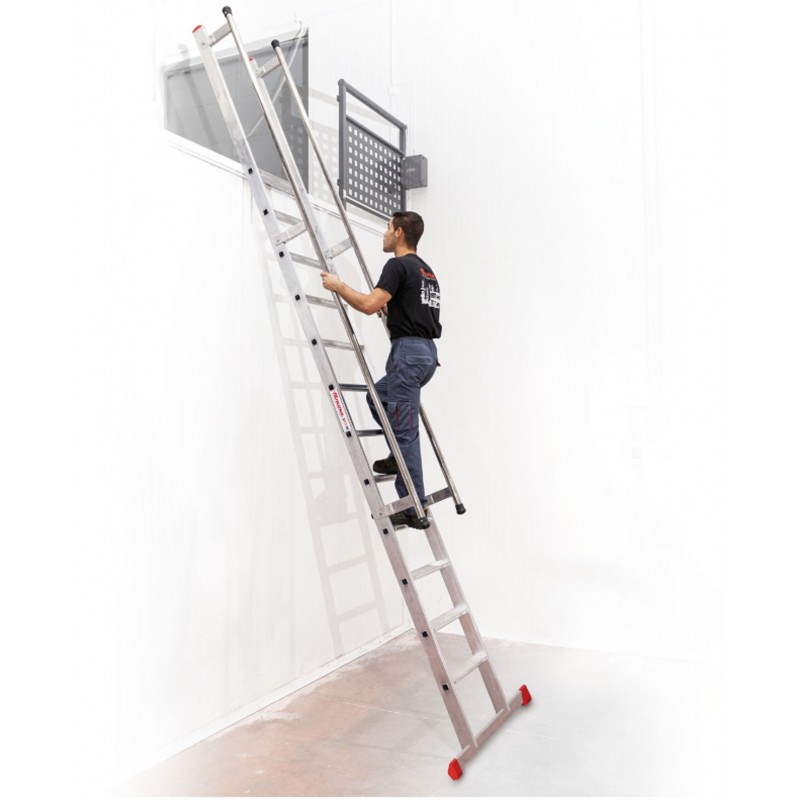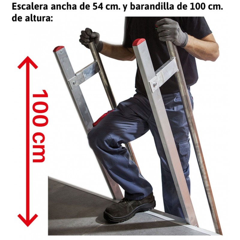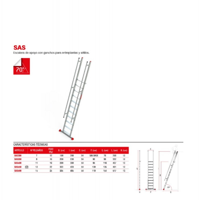 La SAS es una escalera en apoyo para subirse en total seguridad en una entreplanta o un altillo. Si necesitas subirte a una entreplanta o un altillo, pero no tienes espacio para montar una escalera fija este modelo de escalera es lo que necesitas. Tiene los peldaños antideslizantes de 8 cm y una inclinación de 70º que asegura una subida cómoda, y gracias a los pasamanos laterales y a la barandilla de seguridad de 100 cm de altura puesta en la parte de arriba; el desembarco será cómodo y seguro. Además, se entrega con dos ganchos que se pueden fijar a cualquier altura, esto permite asegurar bien la escalera antes de subirse.