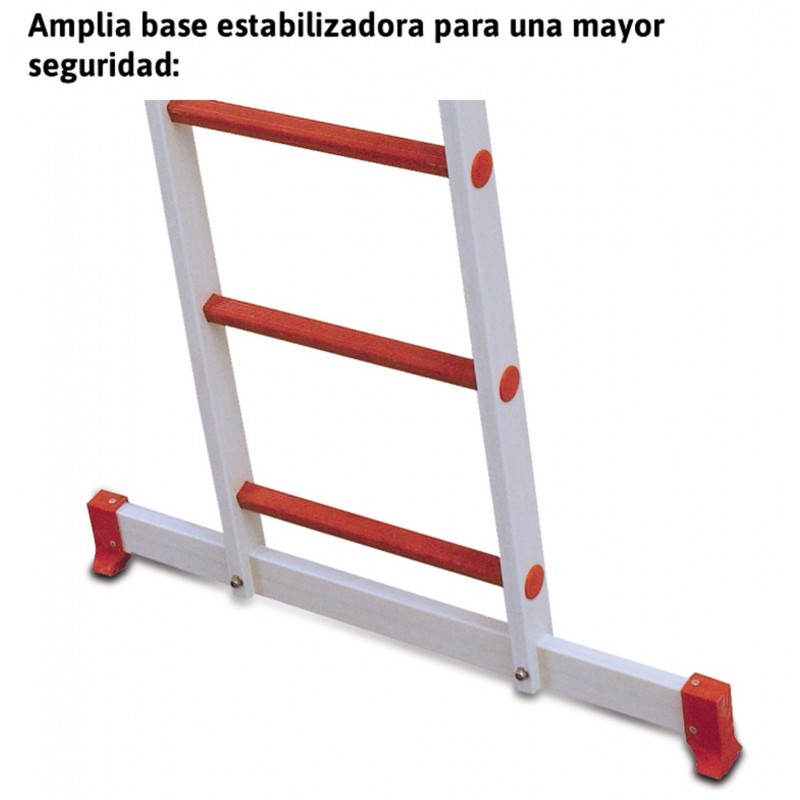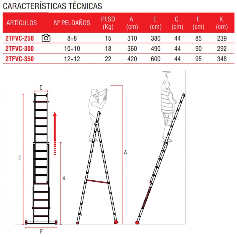 El modelo 2TFVC está compuesto de 2 tramos fabricados en fibra de vidrio. El modelo puede emplearse en 2 posiciones distintas: forma extendida, los 2 tramos se acoplan entre sí, y forma auto- estable, 2 tramos en posición de tijera. Además, está equipado con una base estabilizadora con tacos de goma antideslizantes y adherentes a la superficie del suelo. Los tramos, por seguridad, no pueden emplearse por separado según normativa. Este modelo es ideal para trabajos con riesgos eléctricos. Este modelo cumple con la normativa EN-131 y EN 61478. Dispone de certificado de conformidad y manual de instrucciones. La carga máxima que aguanta es de 150 kg.