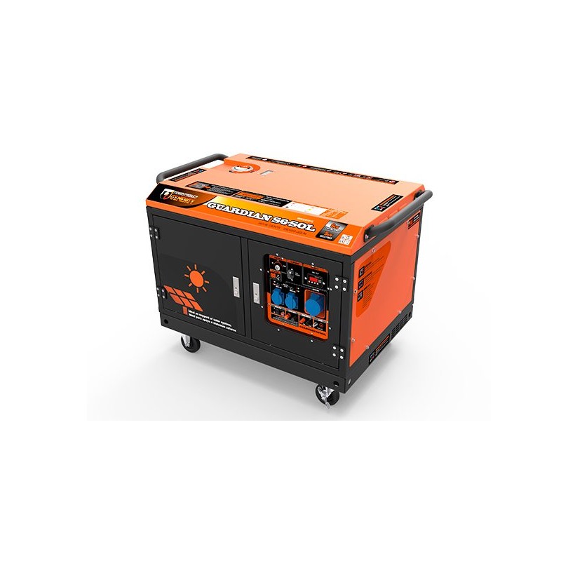Generador apoyo solar Guardian S6 Sol 6000W 230V Genergy, monofásico, arranque eléctrico y manual, señal NA en apoyo a sistemas solares. Retardo de salida de emergencia en modo automático. Gran protección y reducción de ruido. Resistencia a sobrecarga(protección por disyuntor térmico) Resistencia a la corrosión ambiental.Parada automática en caso de mantenimiento.