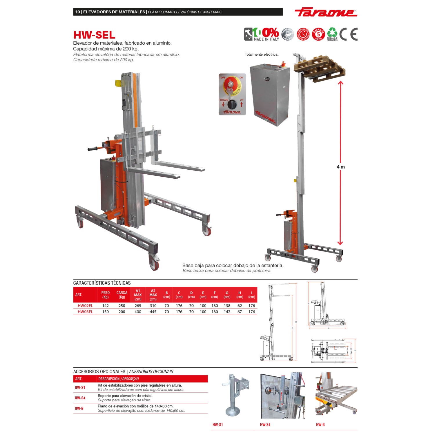 Elevador de material, capacidad máxima de 200 kg, h. máx 4 y ajuste eléctrico.