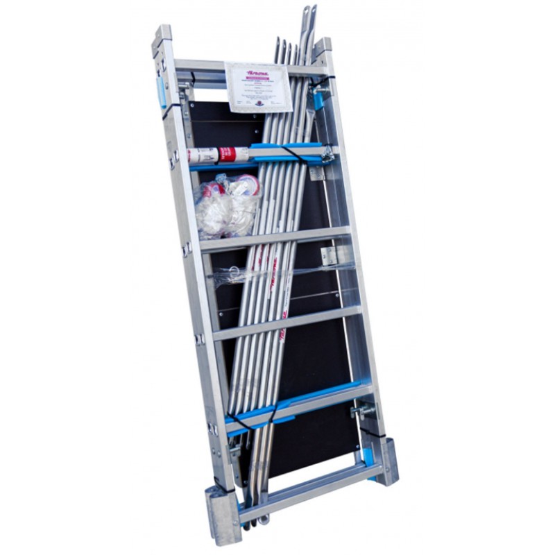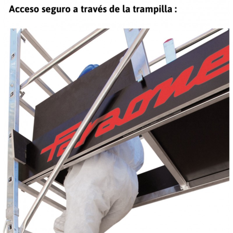 La principal ventaja de este producto es su rápido montaje, ya que dispone de módulos a diferente altura que, combinados, alcanzan una altura de hasta 4,5 m. Obligatorio el anclaje de la estructura a partir de 3 metros de altura.