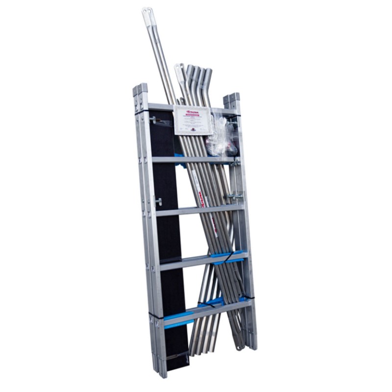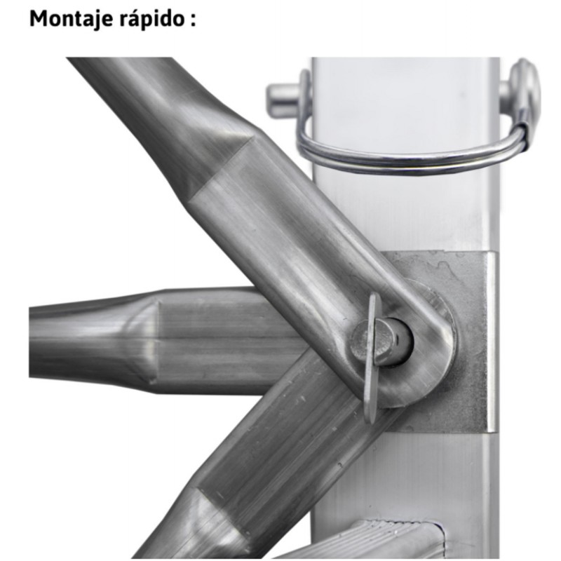 La principal ventaja de este producto es su rápido montaje, ya que dispone de módulos a diferente altura que, combinados, alcanzan una altura de hasta 4,5 m. Obligatorio el anclaje de la estructura a partir de 3 metros de altura.
