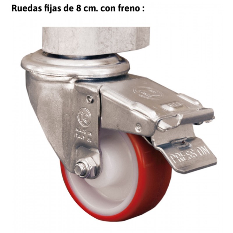 Fabricado en aluminio, con una plataforma de madera con zócalos de 60x140 cm., ruedas de 8 cm de diámetro y freno a presión y bases estabilizadoras laterales con tapones de alta adherencia.