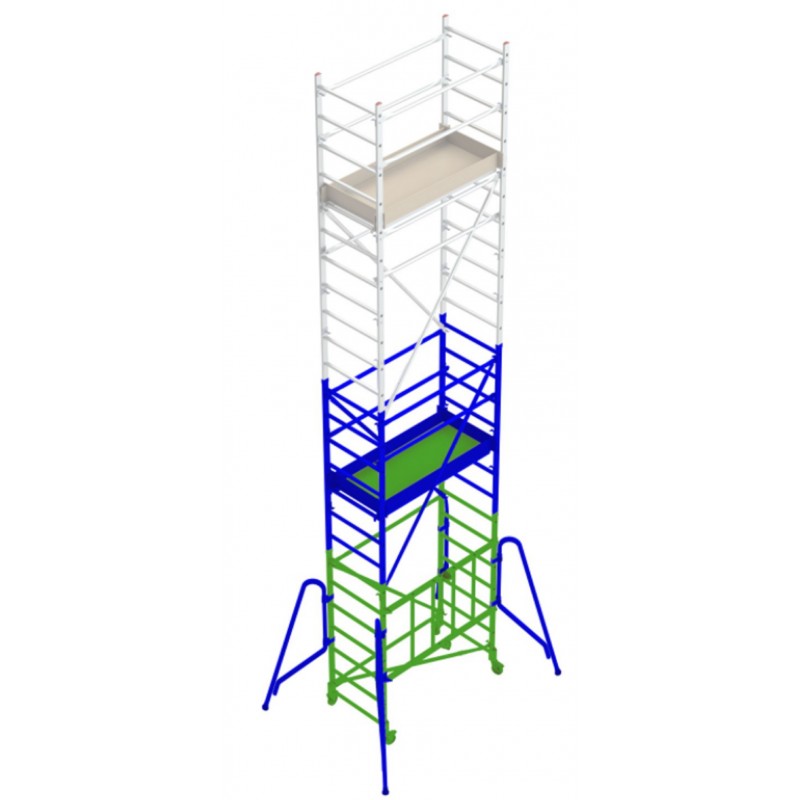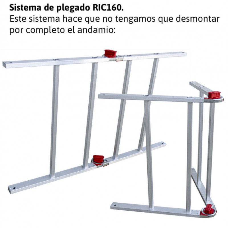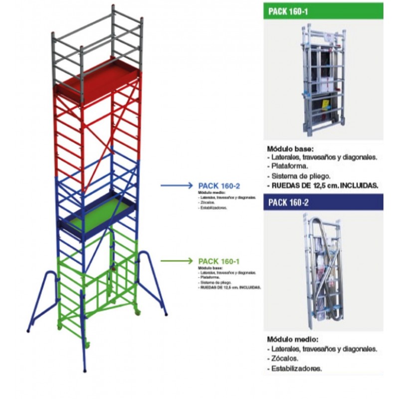 Módulo base + Plataforma + Módulo intermedio + Zócalos + Estabilizadores ( PACK-160-1 + PACK-160-2 ) Andamio de aluminio RAPIDO160, plegable con plataforma de 80x160 cm y altura de 4 m
