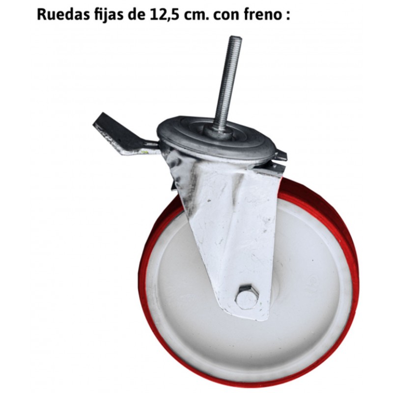 Fabricado en aluminio, con una plataforma de madera con zócalos de 160x80 cm, ruedas de 12,5 cm de diámetro y freno a presión y bases estabilizadoras laterales con tapones de alta adherencia.