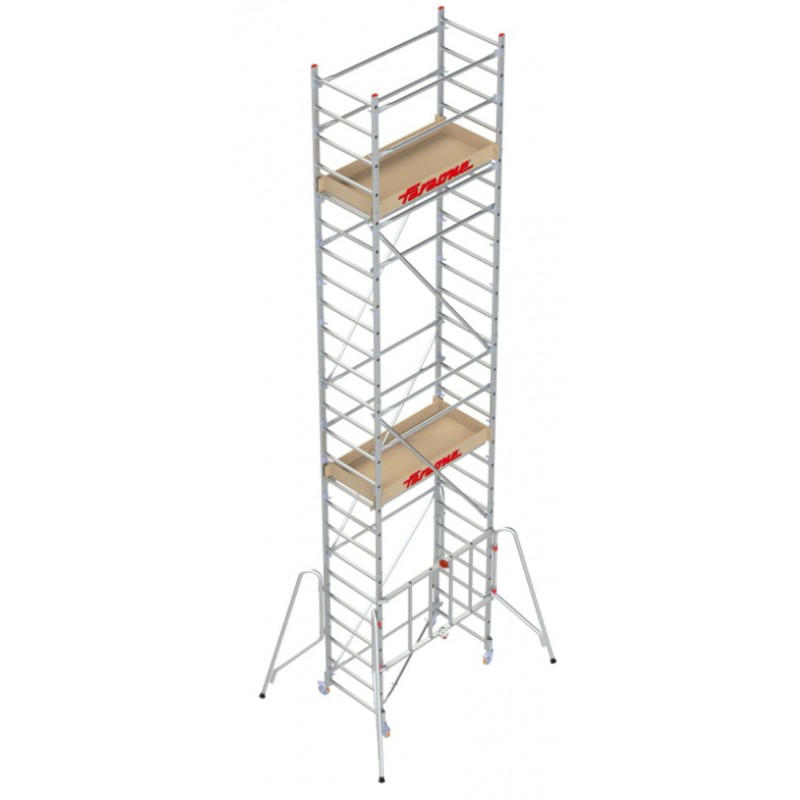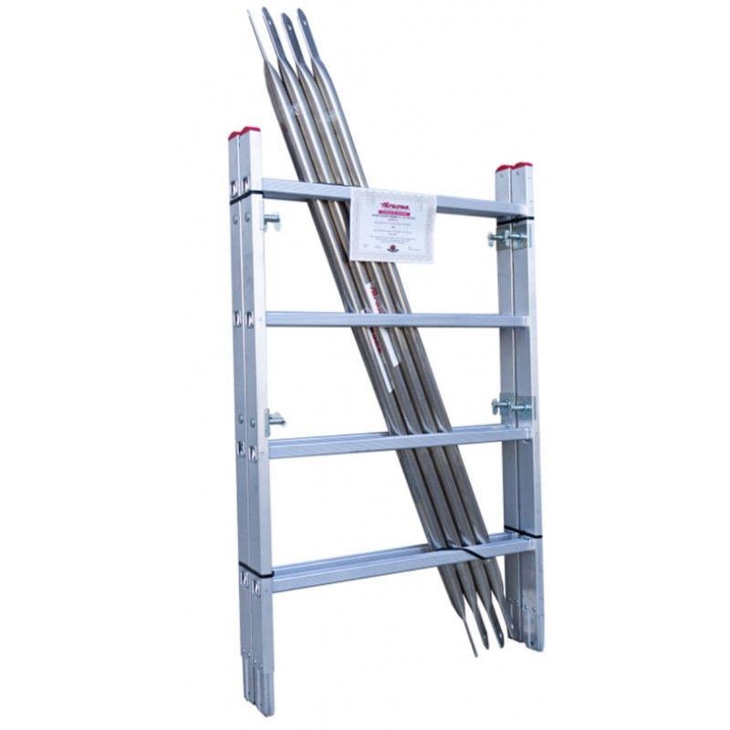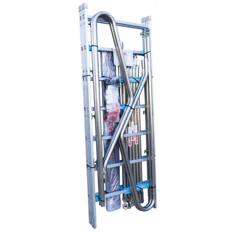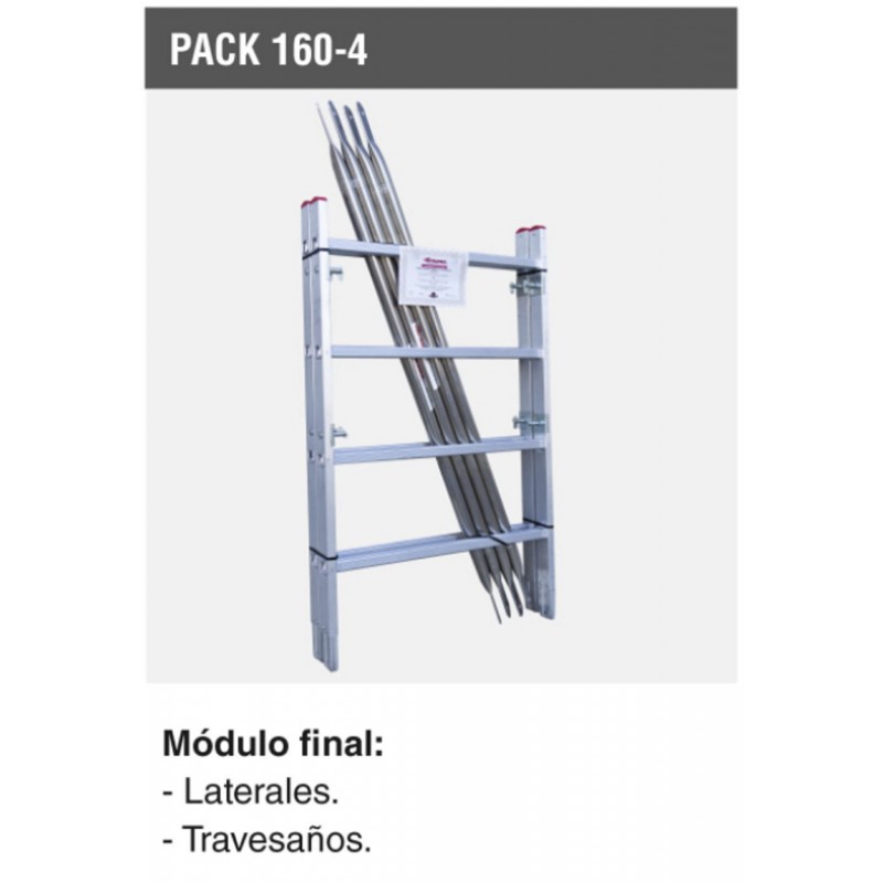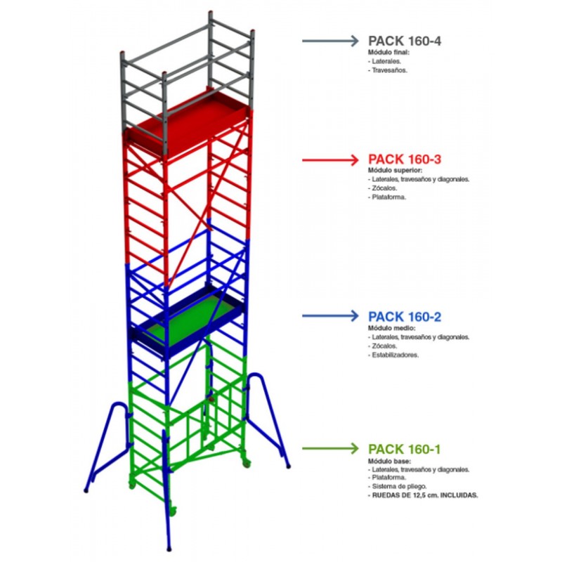 Módulo base + 2 Plataforma + Módulo intermedio + 8 Zócalos + Estabilizadores + Módulo intermedio + Módulo final ( PACK-160-1 + PACK-160-2 + PACK-160-3 + PACK-160-4) Andamio de aluminio RAPIDO160, plegable con plataforma de 80x160 cm y altura de 7 m
