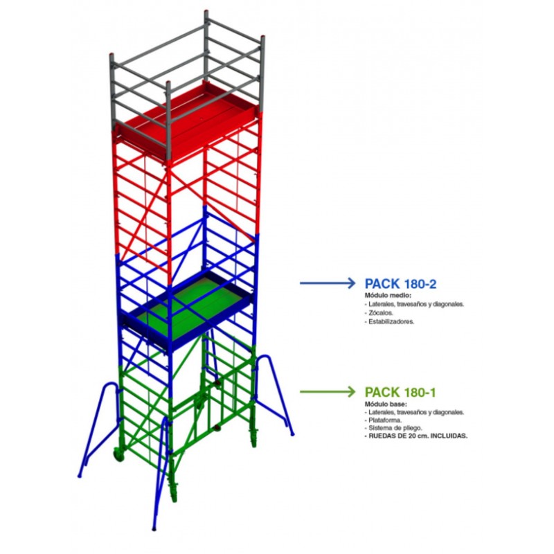Módulo base + Plataforma + Módulo intermedio + Zócalos + Estabilizadores ( PACK-180-1 + PACK-180-2) Andamio de aluminio RAPIDO180, plegable con ruedas regulables, plataforma de 105x180 cm y altura 4 m