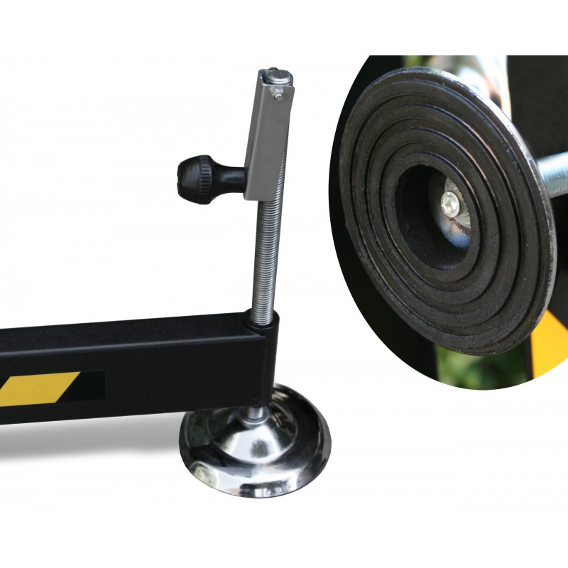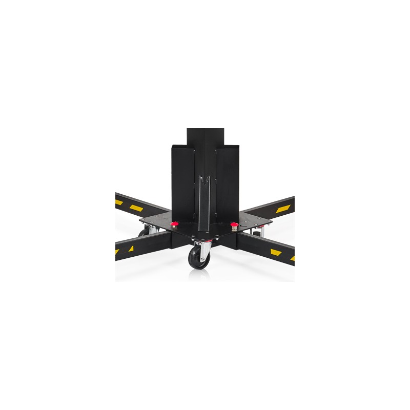 La torre está equipada con cuatro patas desmontables dotadas de husillos niveladores de doble paso (mayor velocidad), con discos antideslizantes de acero cromado y caucho inyectado que garantiza un perfecto ajuste a todo tipo de superficies.