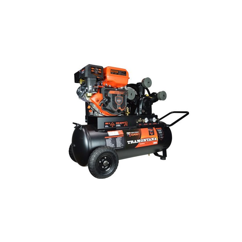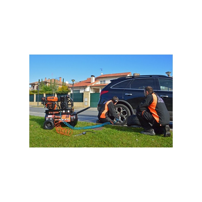 - Calderin de 100L fabricado en acero y equipado con kit de transporte profesional. Permite el transporte del compresor por un solo operario.