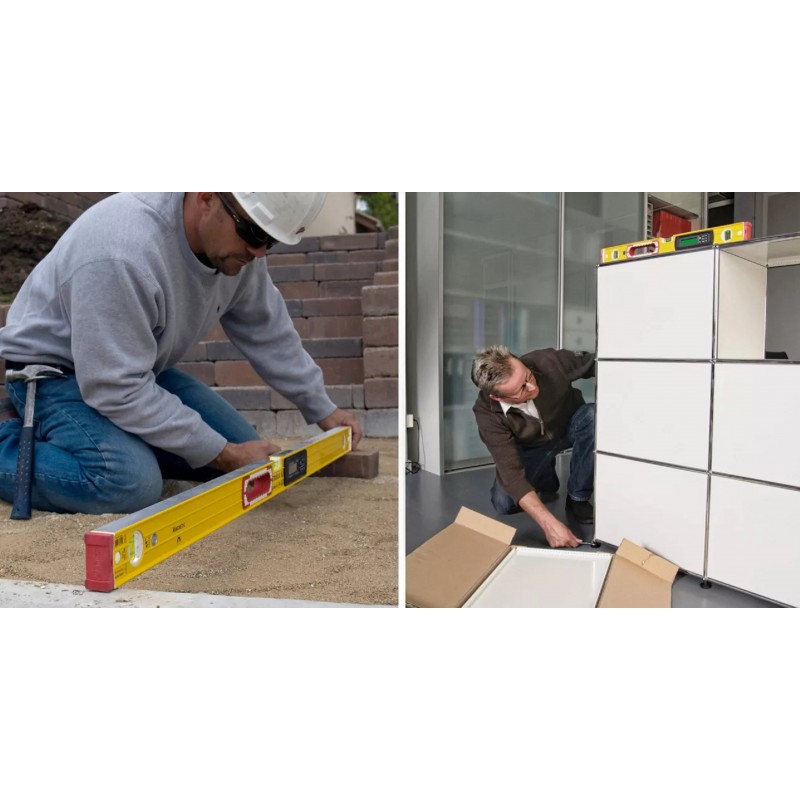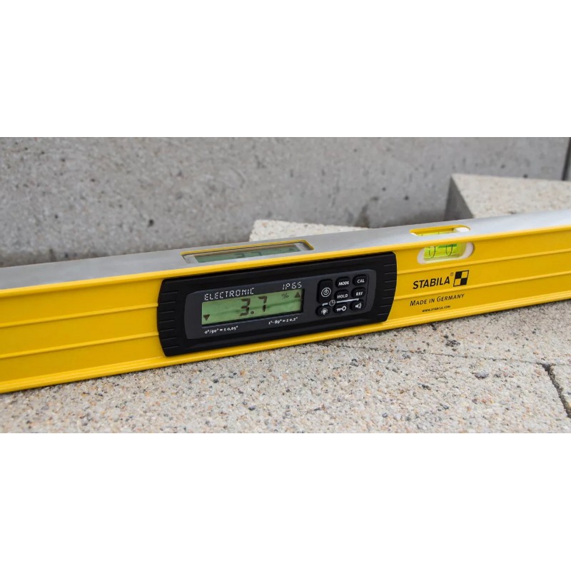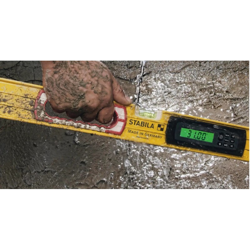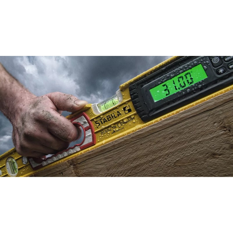 Este nivel de burbuja de alta calidad, robusto y práctico, es ideal para todos los gremios. Su tecnología de medición electrónica y sus burbujas de precisión agilizan y facilitan el trabajo. Las dos pantallas digitales iluminadas se pueden leer tanto desde la parte superior como desde el lateral. Es estanco al agua y al polvo conforme a IP 65 y por consiguiente se puede lavar completamente. STABILA ha equipado a este nivel de burbuja electrónico con todo aquello que el profesional necesita en su trabajo convirtiéndolo en un instrumento versátil e imprescindible.