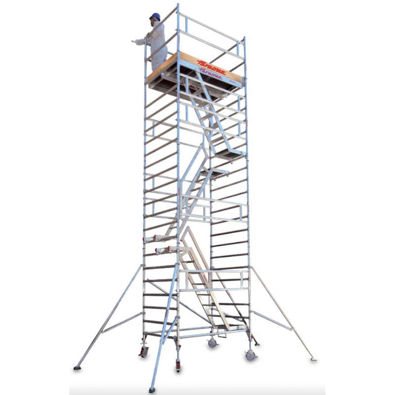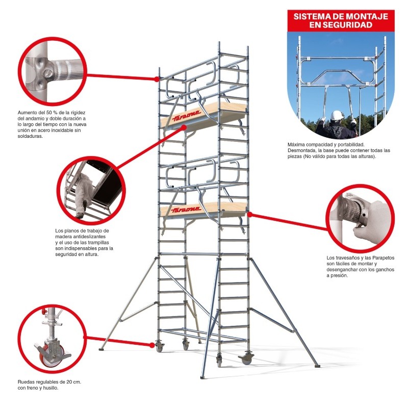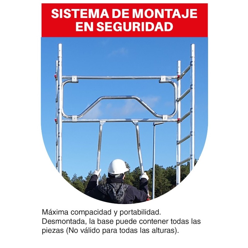 La subida es cómoda gracias a una menor distancia entre peldaños, 7 peldaños por cada lateral en lugar de los 6 que se suelen poner en los laterales de los andamios disponibles en el mercado.
